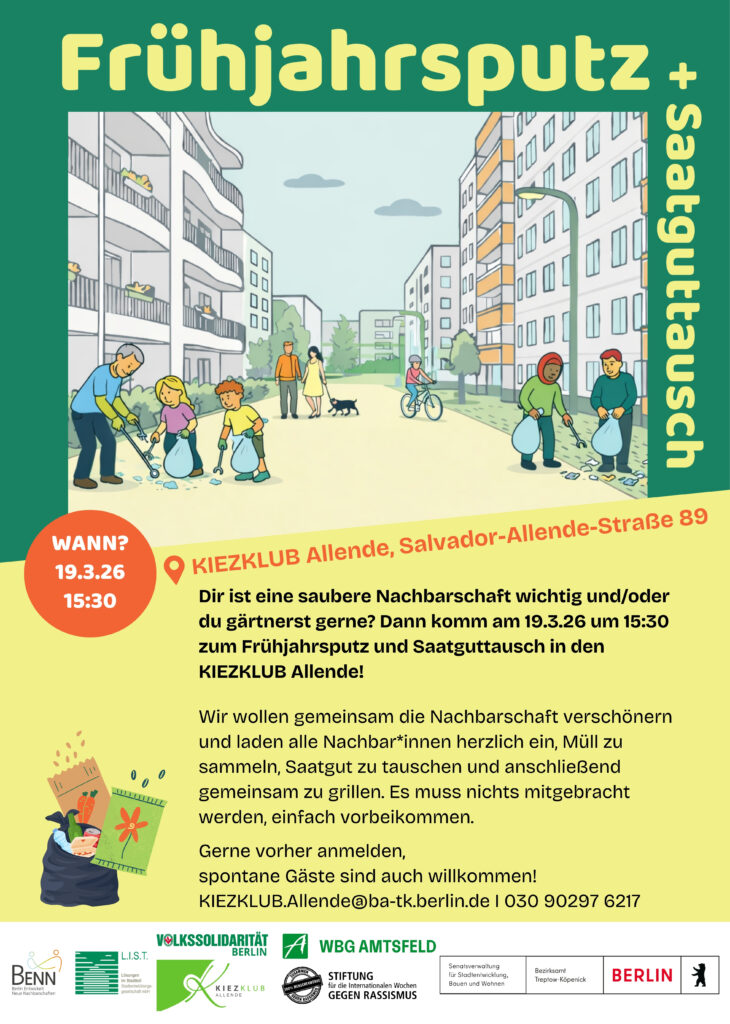 Dir liegt eine saubere Nachbarschaft am Herzen oder du gärtnest gerne? Dann sei am 19.3.26 um 15:30 im KIEZKLUB Allende dabei! (Salvador-Allende-Str. 89). Gemeinsam sammeln wir Müll, tauschen Saatgut und grillen anschließend zusammen. Nichts mitbringen – einfach vorbeikommen!