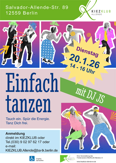 weiter lesenTauch ein. Spür die Energie. Tanz Dich frei. – Mit DJ JS. 📌 Vorherige ANMELDUNG erforderlich direkt im KIEZKLUB Allende oder unter ☎️ 030 90297 6217 oder E-Mail: kiezklub.allende@ba-tk.berlin.de Der Einlass erfolgt ab einer halben Stunde vor Veranstaltungsbeginn. ——————————————————————— Eine Veranstaltung des Fördervereins KIEZKLUB Allende e.V. Diese Veranstaltung wird durch #Spenden ermöglicht. #IhreSpendewirkt —————————————————————–