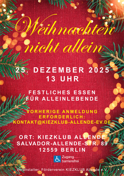 weiter lesenDer Förderverein KIEZKLUB Allende e.V. lädt zu Weihnachten 2025 erstmals zu einem festlichen Essen für Alleinlebende ein. Die Einladung richtet sich an Menschen, die niemanden haben, mit dem sie die Feiertage verbringen können, die aber nicht alleine sein möchten. Eintritt frei. Vorherige Anmeldung erforderlich! Anmeldungen bitte per Mail an: kontakt@kiezklub-allende-ev.de Einlass 30 Minuten vor Veranstaltungsbeginn.…