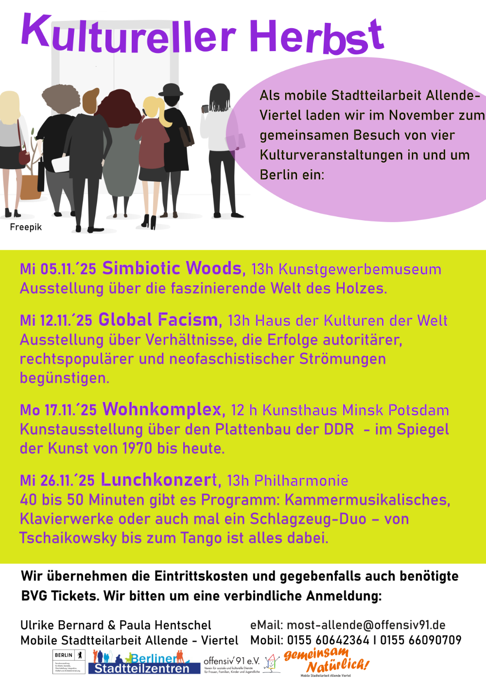 Als mobile Stadtteilarbeit Allende-Viertel laden wir im November zum gemeinsamen Besuch von vier Kulturveranstaltungen in und um Berlin ein.