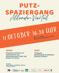 Am 17. Oktober ab 16:30 Uhr findet daher im Allende-Viertel ein Putzspaziergang statt. Das notwendige Material zum Abkratzen und Entfernen der Hassbotschaften wird gestellt. Treffpunkt ist die Bushaltestelle Krankenhaus Köpenick (DRK Kliniken) Südseite (gegenüber dem Volkspark).