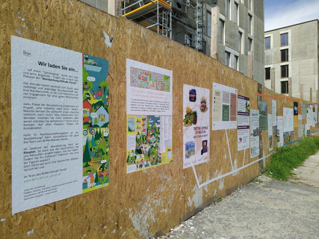 Ab Mai 2021 wurde der Bauzaun um die MUF Salvador-Allende-Straße in eine bunte Wandzeitung verwandelt. Akteur*innen und Initiativen aus dem Allende-Viertel stellten Plakate aus und auch unsere Kiezkarte fand ihren Platz am Zaun.